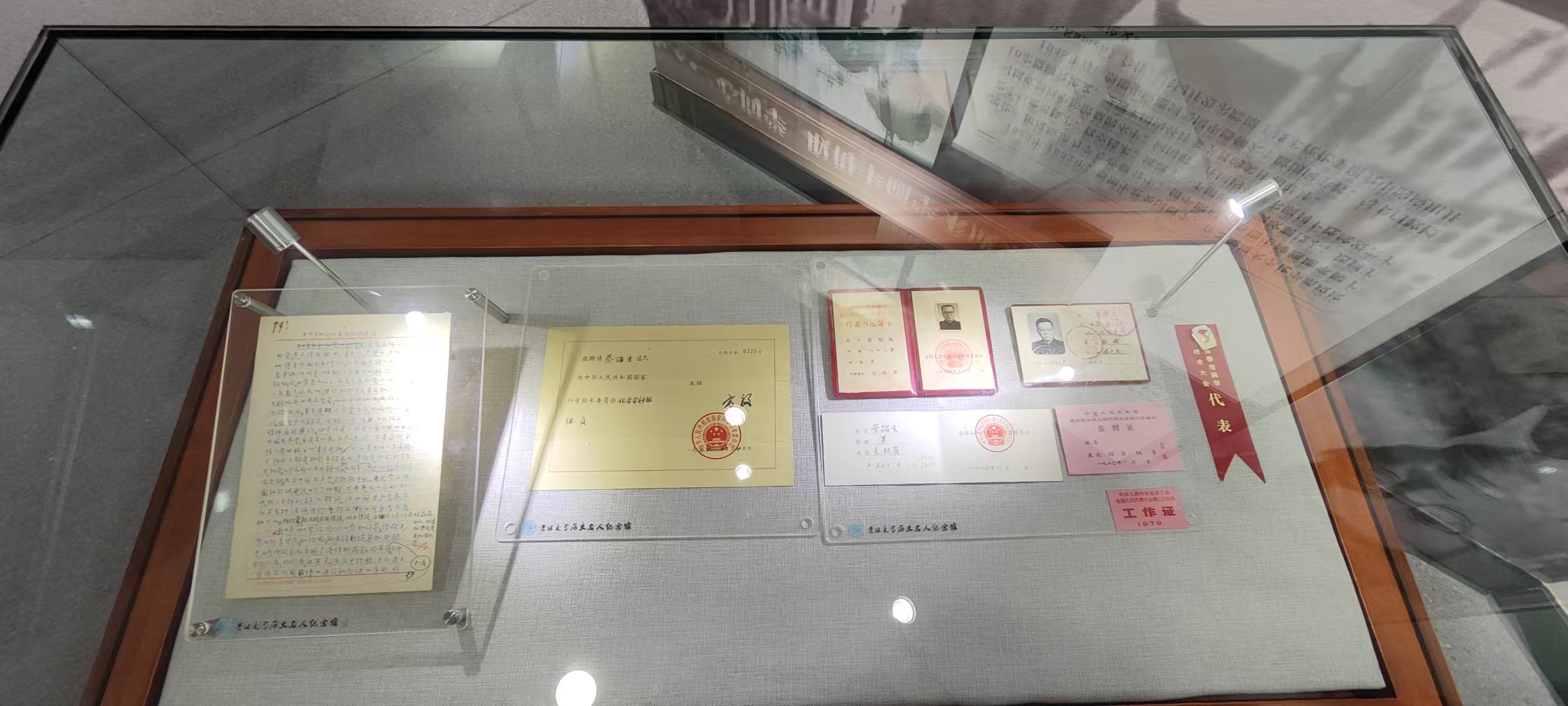 2025 年 10 月 15 日,蔡镏生教授的孙女蔡泉女士,怀着对先辈的深切缅怀与传承精神的热忱,将家族珍藏多年的蔡镏生教授生前遗物郑重捐赠给档案馆。此次捐赠的史料品类丰富、意义深远,涵盖多件极具历史价值的实物:既有 1982 年吉林大学化学系为表彰蔡镏生教授深耕教坛所颁发的任教 55 周年纪念牌匾,见证其数十年如一日的育人坚守;也有蔡镏生教授亲笔书写的入党申请书草稿,字里行间饱含着他对理想信念的赤诚追求;此外,还包括蔡镏生教授在吉林大学任职期间的工作证、国家科学技术委员会化学学科组组员聘书、全国人大代表当选证书,以及长春科学技术大会代表胸签等重要物件。